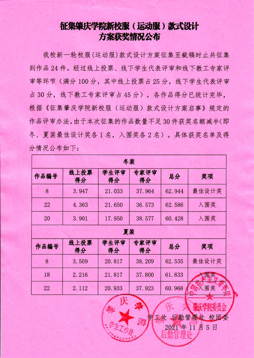 必赢565net官网新一轮校服(运动服)款式设计方案征集至截稿时止共征集到作品24件。经过线上投票、线下学生代表评审和线下教工专家评审等环节(满分100分,其中线上投票占25分,线下学生代表评审占30分,线下教工专家评审占45分),各作品得分已统计完毕,根据《征集必赢565net官网新校服(运动服)款式设计方案启事》规定的作品评审办法,由于本次征集的作品数量不足30件获奖名额减半(即冬、夏装最佳设计奖各1名,入围奖各2名)。具体获奖名单及得分情况公布如下: