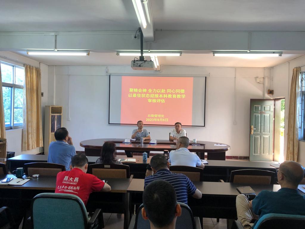 会上,欧就生传达了学校迎评工作会议精神,强调迎接本科教育教学评估是目前学校最重要的工作,全体后勤员工务必聚精会神,全力以赴做好相关工作。