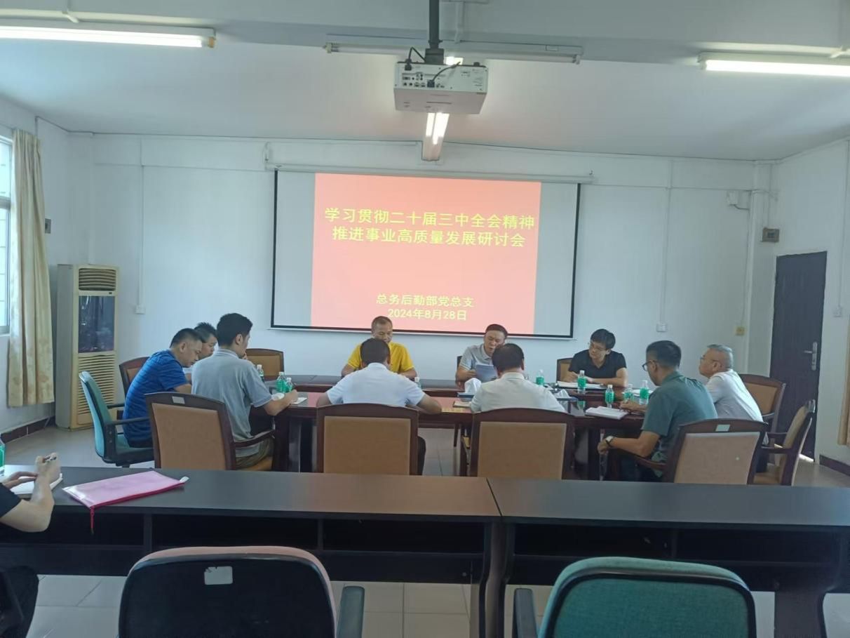 8月28日,总务后勤部在五楼会议室召开以“学习贯彻二十届三中全会精神,推进后勤事业高质量发展”为主题的研讨会。部班子成员和各科室科长、中心正副主任和校医院正副院长参加会议。