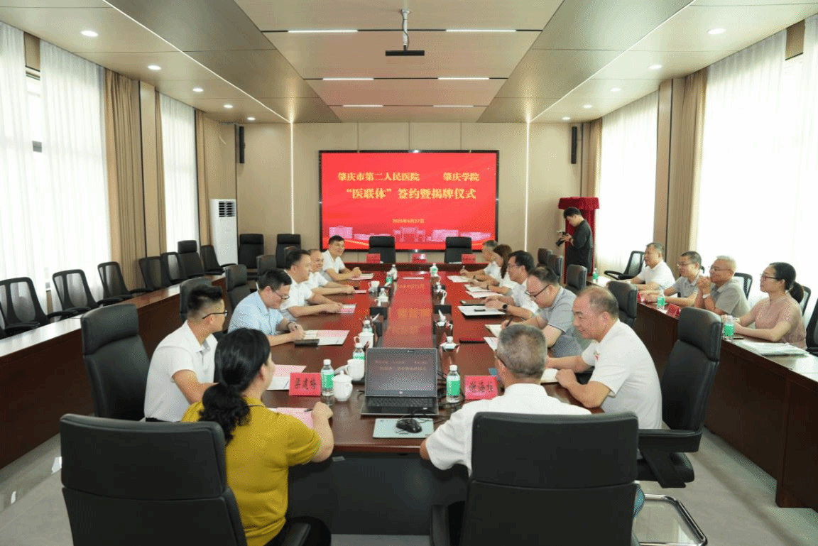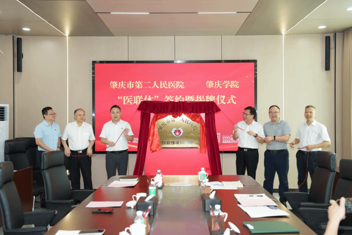 6月27日,肇庆市第二人民医院与必赢565net官网“医联体”签约暨揭牌仪式在必赢565net官网举行。市第二人民医院党委书记隋欢四,学校党委书记谢冠华出席仪式,学校党政办公室、宣传统战部、学生工作部、资产设备管理部、总务后勤部、工会等相关负责人参加。